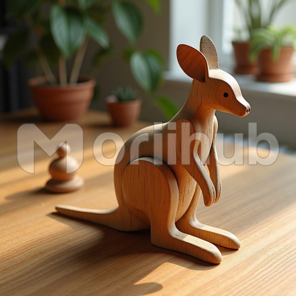 A beautifully crafted wooden sculpture of a kangaroo rests on a table. The figure is skillfully carved, showcasing the kangaroo’s strong legs and unique posture. The smooth finish of the wood highlights the intricate details of its muscular form and the gentle curves of its tail. The sculpture is warm in tone, drawing attention to the natural grain of the wood. Its simple yet elegant design brings a touch of nature and artistry to the table, making it a striking decorative piece.