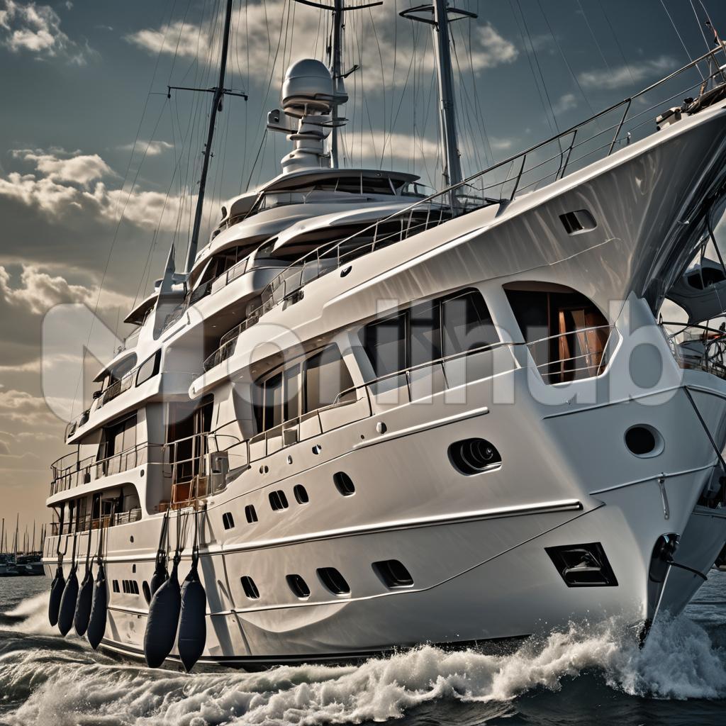 A pristine white yacht gracefully glides across the sparkling azure waters of the sea, its sleek design a testament to luxury and elegance. The sun shines brightly, casting a brilliant sheen on the yacht’s polished surface, while the gentle waves create a soothing, rhythmic sound. Onboard, the passengers are enjoying the perfect day out at sea, lounging on the deck with sun hats and sunglasses, sipping on refreshing beverages. The yacht features spacious decks, a luxurious seating area, and a shaded canopy providing respite from the sun. In the distance, the coastline with its lush greenery and sandy beaches forms a picturesque backdrop. The yacht, cutting through the water with ease, epitomizes the ultimate in leisure and relaxation, a symbol of opulence and the freedom of the open sea.