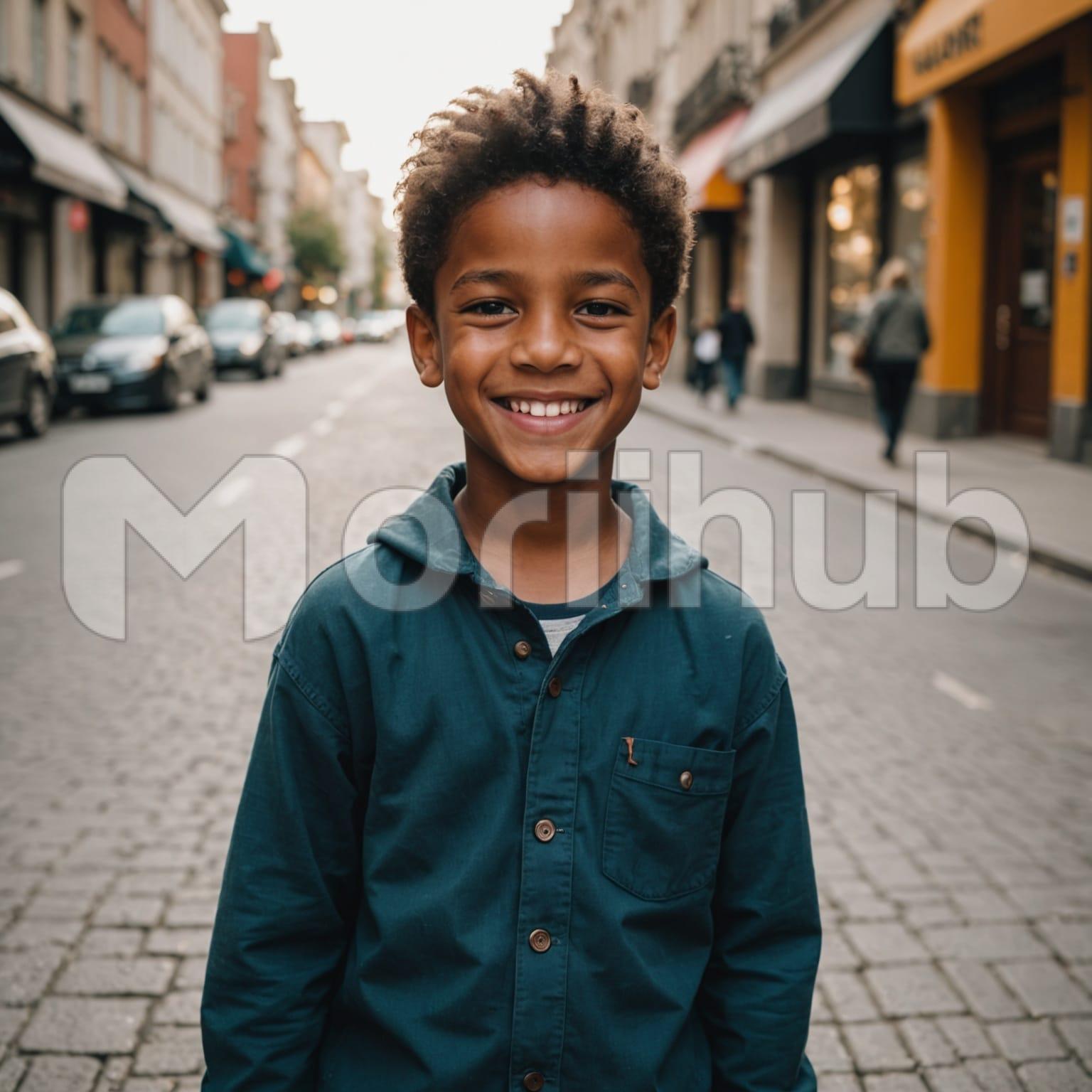 A young boy stands on the street, his face brightened by a gentle smile. His eyes hold a quiet curiosity, as though he’s taking in the world with open wonder. The air around him feels calm, the moment simple yet full of presence. His posture is easy, unposed, as if the smile came naturally. The street behind stretches out with faint activity, but he remains the clear focus. There’s a lightness in his expression that makes the scene both warm and quietly memorable.