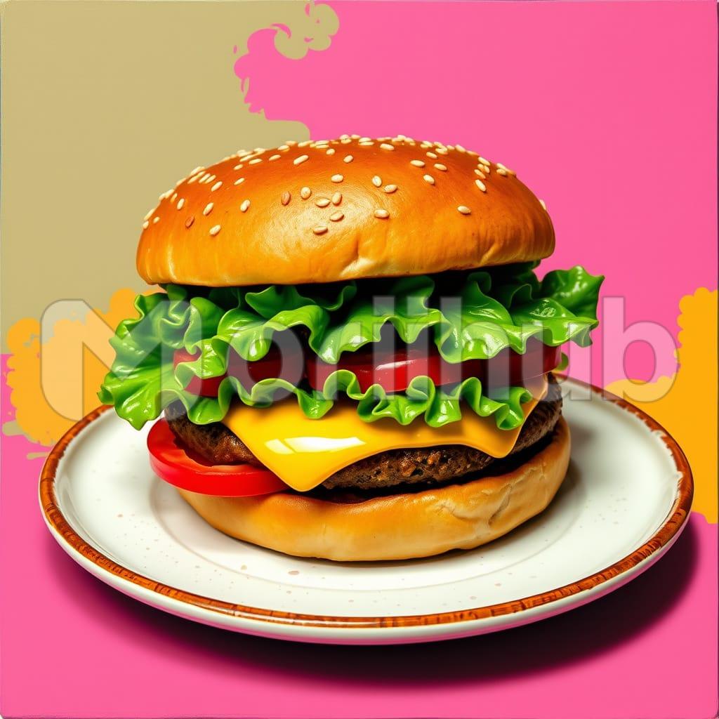 A burger rests on a plate, its layers clearly defined. The sesame-covered top bun sits slightly askew, showing the crisp lettuce beneath, a slice of tomato tucked just below it, and melted cheese draped over the patty. The bottom bun holds the stack firmly, its edge lightly browned. The plate is bare except for the burger, drawing all attention to the neatly arranged ingredients. Each layer appears fresh, the textures distinct—soft bun, leafy greens, juicy tomato, rich cheese, and the patty at the center, holding the balance of the whole.
