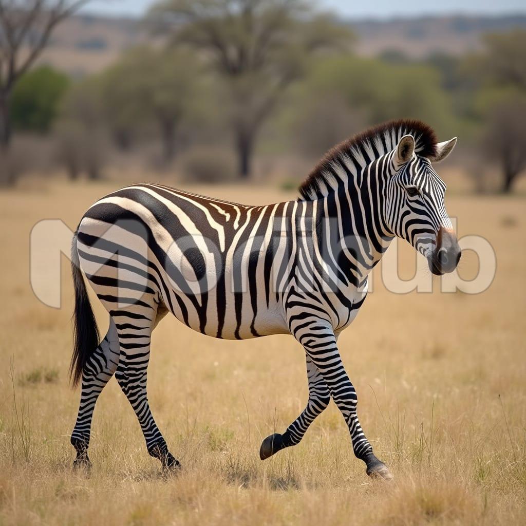 A zebra strides confidently across the open savannah, its black and white stripes creating a striking pattern against the golden landscape. The animal’s graceful movements are fluid, with each step leaving an imprint on the sandy terrain. Its alert eyes scan the vast surroundings, ever aware of its environment. The landscape stretches endlessly, with dry grasses swaying gently in the breeze. The serene scene embodies the natural elegance and adaptability of this iconic African creature as it navigates the expansive land.