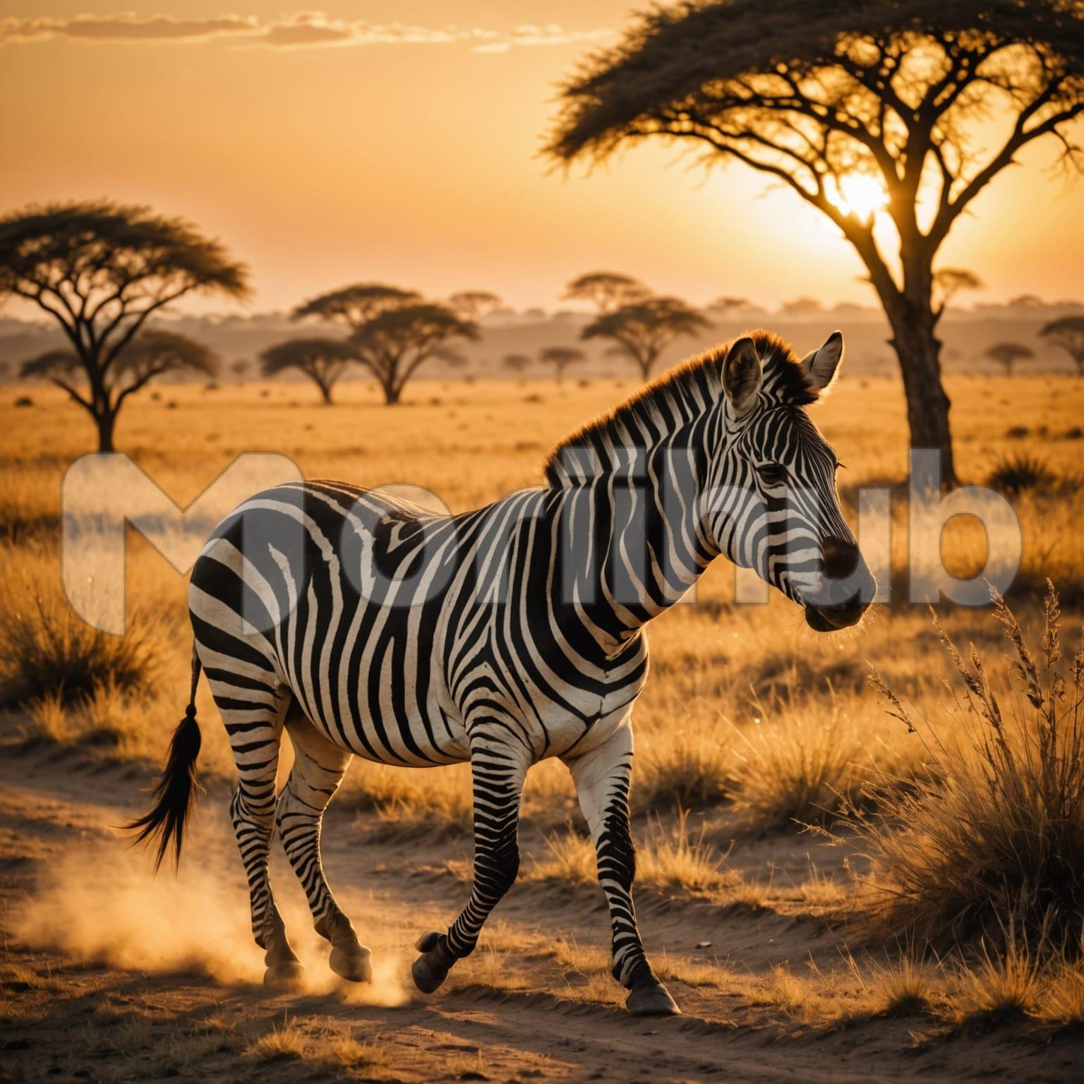 A zebra walks across the savannah, its stripes distinct against the open stretch of land. The vast plain extends in all directions, with trees standing in the distance, their presence shaping the horizon. Each step of the zebra is steady, purposeful, as it follows its path beneath the wide sky. The light of sunset falls across the scene, softening the view while marking the close of the day. The zebra continues forward, a calm figure moving through the openness of the savannah, framed by land, trees, and sky.