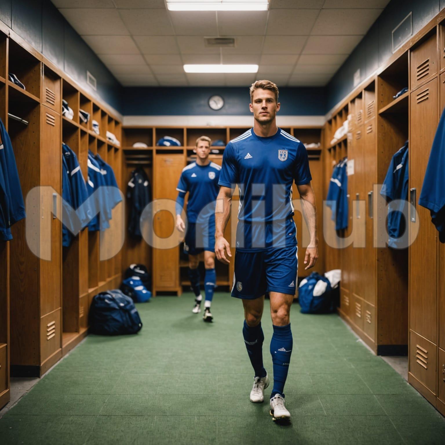 The footballer stands in the locker room, his uniform still on, sweat glistening from the game. His teammates chat and laugh around him, some stretching, others getting ready to leave. He takes a moment of silence, reflecting on the match, before slipping off his cleats and joining the camaraderie.